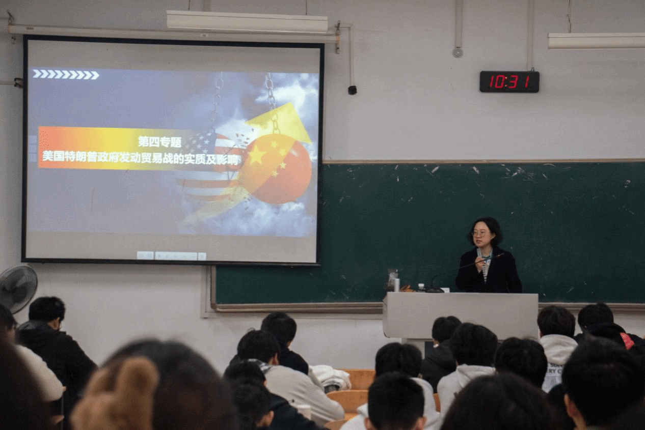 在“国际博弈中的材料行业机遇”主题的第二场讲座中,杨老师结合“2019年美国对人工智能领域实施技术制裁”案例,同时围绕中美元首会晤的战略意义,解读材料企业“走出去”创造的稳定环境。讲解中还通过互动,引导学生结合专业思考“如何提升竞争力应对国际挑战”,帮助大家搭建“时政热点—政策导向—专业发展”的关联桥梁。